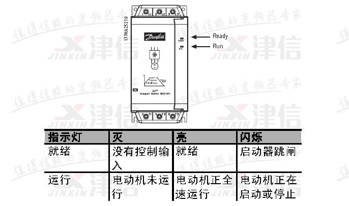 在MCD200軟啟動器面板上,有就緒和運行兩盞顯示燈,當正常運行時,運行燈亮,當發生故障時,就緒顯示燈會出現閃爍,并以不同閃爍次數代表不同的故障含義: