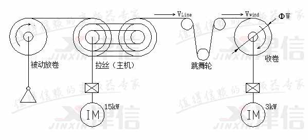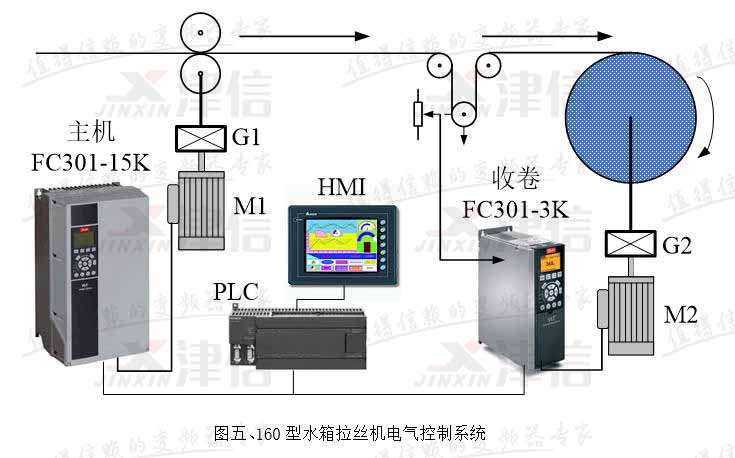 水箱拉絲機(jī)是子午線輪胎用鋼簾線生產(chǎn)企業(yè)的關(guān)鍵設(shè)備,其收卷控制是變頻器跳舞輪位置反饋控制。由于生產(chǎn)速度快,用量大,加上環(huán)境比較惡劣,因此要求采用性能優(yōu)異,穩(wěn)定性好,質(zhì)量可靠和抗腐蝕能力強(qiáng)的變頻器。我廠為拉拔0.22毫米以下線徑的鋼簾線定制了160型新型水箱拉絲機(jī)上,全部選用了丹佛斯最新推出的FC系列變頻器作收卷和主傳動(dòng)驅(qū)動(dòng),取得了很好的運(yùn)行效果。