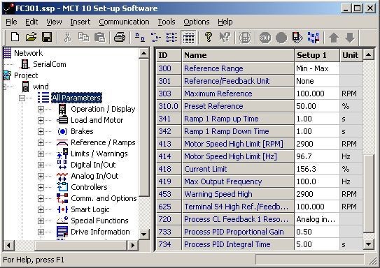 圖六為MCT10軟件顯示的FC301變頻器的參數(shù)設(shè)置(部分)。