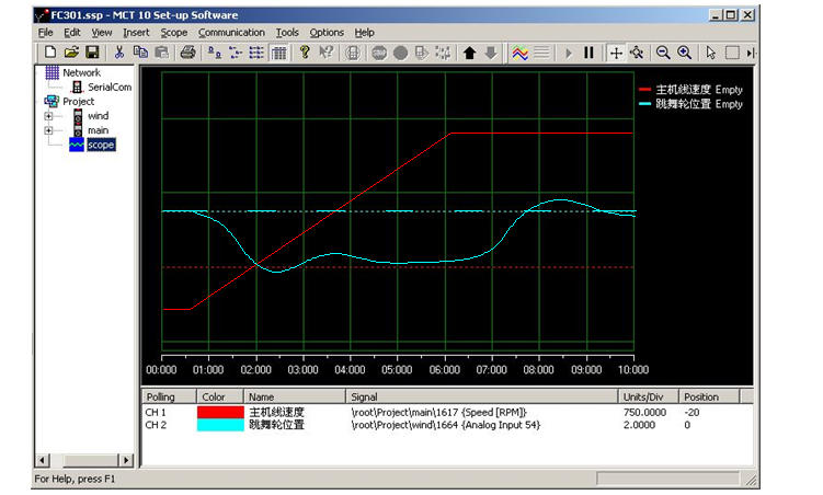 卷繞控制的特點(diǎn):同樣的一套PID調(diào)節(jié)參數(shù),勻速時(shí)易于穩(wěn)定,波動(dòng)也較小;而加速時(shí)就不易于穩(wěn)定,而且因?yàn)樘栎單恢糜徐o差,波動(dòng)幅度也較大。因此PID調(diào)節(jié)參數(shù)主要針對(duì)加減速過(guò)程予以優(yōu)化。MCT軟件有數(shù)字示波器功能,通過(guò)實(shí)時(shí)觀測(cè)線速度和跳舞輪位置在加減速時(shí)的變化曲線,能很方便地調(diào)整調(diào)節(jié)參數(shù)。